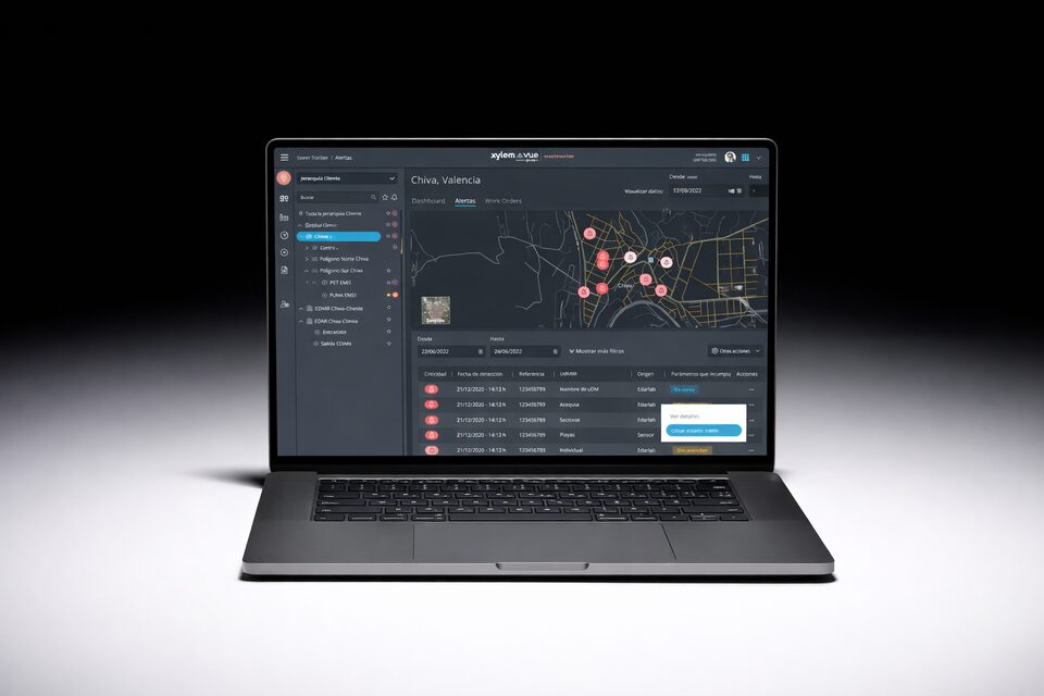 UX/UI design for a desktop platform focused on wastewater treatment plant operations, bringing together monitoring, alarms, maps, and dense technical data into a clearer and more dependable interface system.