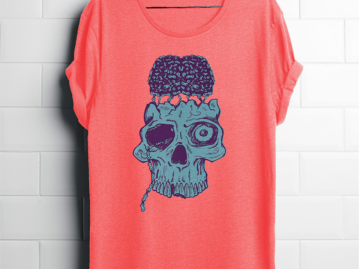 Illustration for a bike clothing brand based in Glasgow. The concept consists on a chain-made brain coming up from a beaten-up skull in a tatoo drawing style.